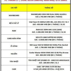 PC THANH LÝ | DUAL XEON 2680V4 (24 NHÂN 48 LUỒNG/ RAM DDR4 64G – 2133 (16X2) / GTX 1660S SUPPER/ NVME 512G/ PSU 650W 80 PLUS | BẢO HÀNH 1 THÁNG