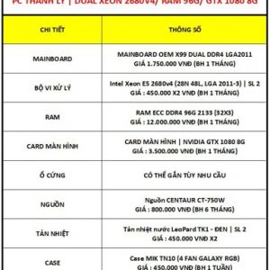PC THANH LÝ | X99 DUAL XEON 2680V4 (24 NHÂN 48 LUỒNG)/ RAM ECC DDR4 96G 2133 (32GX3)/ VGA GTX 1080 8G/ SSD TÙY CHỌN/ PSU 750W | BẢO HÀNH 1 THÁNG