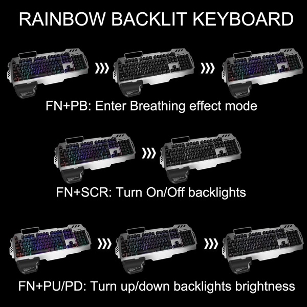 - ✅Combo bàn phím và chuột chơi game: Bàn phím chơi game được làm bằng bảng kim loại màu bạc sáng bóng bằng hợp kim nhôm, chắc chắn và bền bỉ. Thiết kế công thái học của cả bàn phím và chuột giúp bạn không bị mỏi tay; Cảm giác cơ học chuyên nghiệp mang đến cho bạn trải nghiệm sử dụng tuyệt vời.