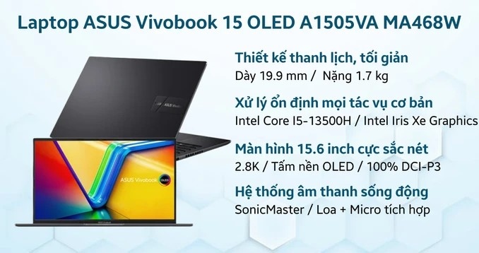 LAPTOP THANH LÝ | ASUS VIVOBOOK A1505VA | CORE I5 – 13500H/ RAM 16G / SSD NVME 512GB/ VGA IRIS XE + MÀN HÌNH OLED 2.8K | LIKE NEW BẢO HÀNH 3 THÁNG