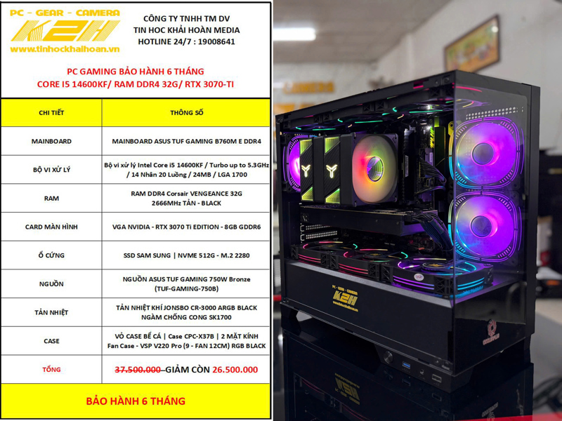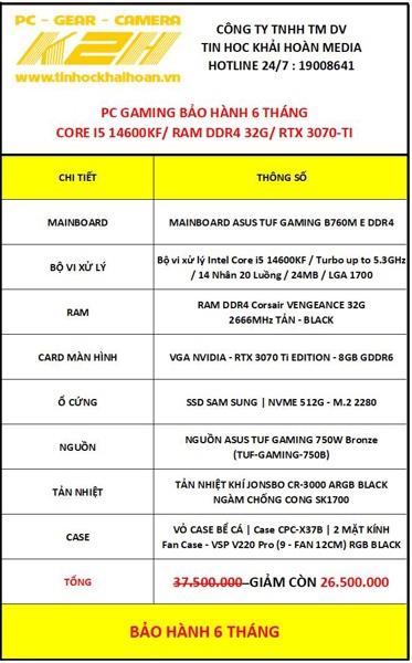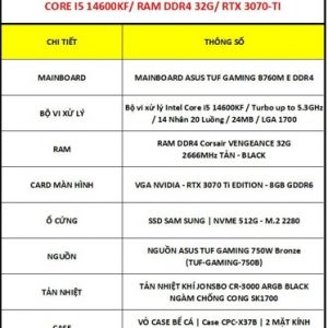 PC GAMING THANH LÝ | TUF B760M/ CORE I5 14600KF/ RAM 32G/ RTX 3070TI – 8G/ SSD NVME 512G/ PSU 750W | BẢO HÀNH 6 THÁNG