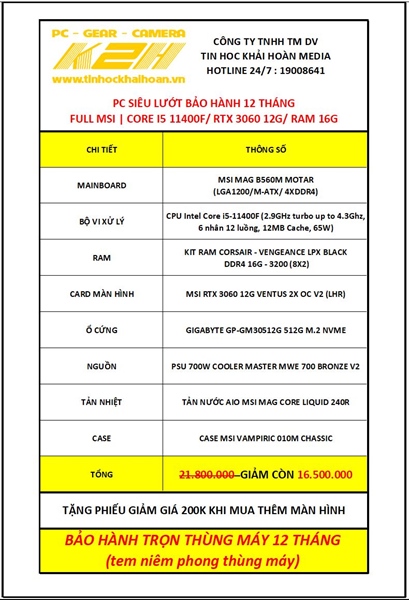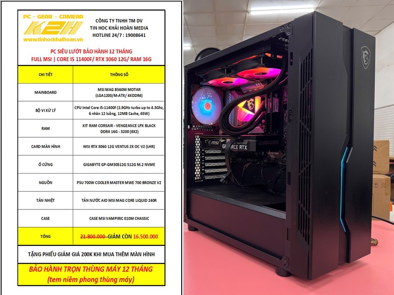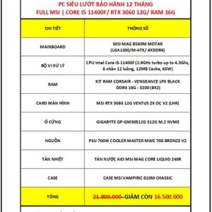 PC SIÊU LƯỚT BẢO HÀNH 12 THÁNG FULL MSI | FULL MSI – CORE I5 11400F/ RTX 3060 12G/ RAM 16G (8X2)/ PSU 700W/ TẢN NƯỚC AIO MSI 240R