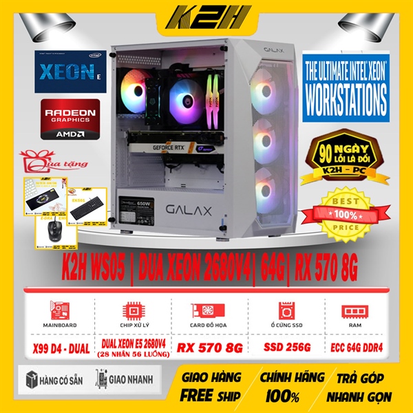 TỐI ƯU CẤU HÌNH | DUAL XEON 2680V4/ RAM ECC DDR4 64G/ VGA RX570 8G/ SSD 256G/ PSU 750W + 4 FAN LED