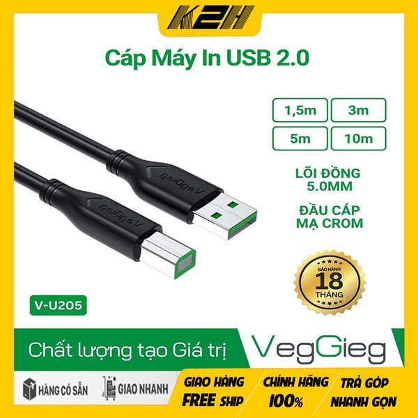 Dây cáp máy in USB 2.0 Veggieg đảm bảo kết nối nhanh chóng và ổn định, bền bỉ theo thời gian, là lựa chọn lý tưởng cho nhu cầu kết nối thiết bị của bạn.