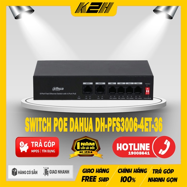 Thiết bị mạng HUB – SWITCH POE Dahua DH-PFS3006-4ET-36 (6-Port Fast Ethernet Switch with 4-Port PoE, chống set 6KV)