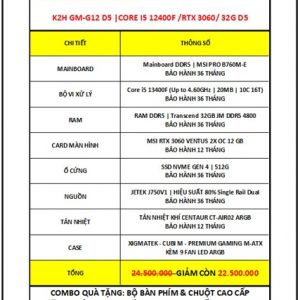 K2H GM-G12 D5 | CORE I5 13400F/ RTX 3060 – 12G/ RAM DDR5 32G/ SSD NVME 512G/ PSU 750W
