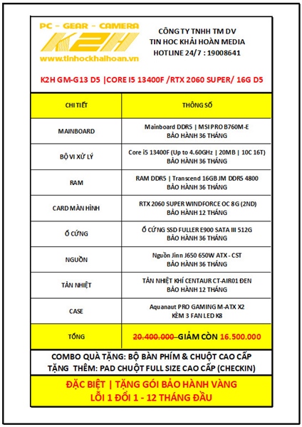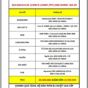 K2H GM-G12 D5 | CORE I5 13400F/ VGA RTX 2060 SUPPER 8G/ RAM DDR5 16G/ SSD 512G/ PSU 650W