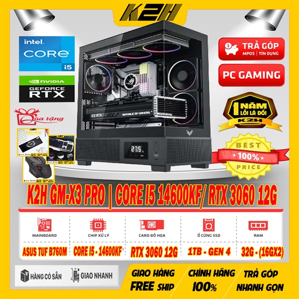 K2H GM-X3 PRO | TUF B760M/ CORE I5 14600KF/ VGA RTX 3060 12G/ RAM 32G/ SSD GEN4 1TB/ PSU 800W + TẢN NƯỚC 240 | TẶNG GÓI BẢO HÀNH ĐẶC BIỆT LỖI 1 ĐỔI 1 – 12 THÁNG ĐẦU