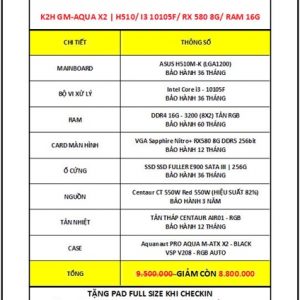 K2H GM-AQUA X2 | H510/ CORE I3 10105F/ RAM DDR4 16G - 3200/ RX 580 8G/ SSD 256G/ 550W + TẢN THÁP RGB + 5 FAN LED