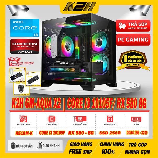 K2H GM-AQUA X2 | H510/ CORE I3 10105F/ RAM DDR4 16G – 3200/ RX 580 8G/ SSD 256G/ 550W + TẢN THÁP RGB + 5 FAN LED