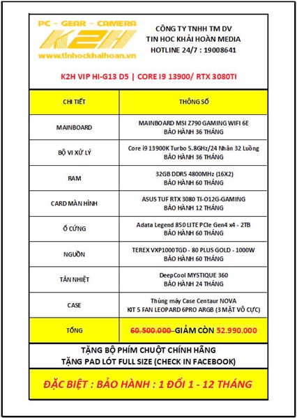 K2H VIP HI-G13 D5 | CORE I9 13900K/ RTX 3080TI 12G/ RAM DDR5 32G/ SSD NVME 2TB/ PSU 1000W + TẢN AIO MYSTIQUE 360