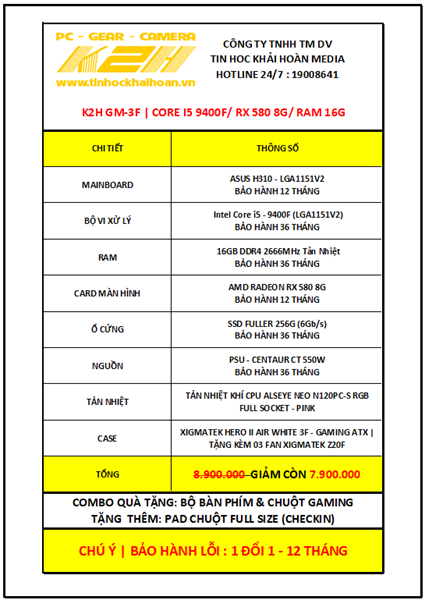 PC GAMING | K2H GM-3F CORE I5 9400F/ VGA RX 580 8G/ RAM 16G/ SSD 256GG/ PSU 550W