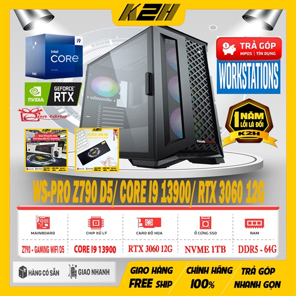 PC WORKSTATION K2H WS-PRO | Z790 WIFI 6E D5/ CORE I9 13900/ RAM DDR5 64G – 5200/ VGA RTX 3060 12G/ SSD NVME 1TB GEN 4/ PSU 850 | TẢN NƯỚC AIO 360